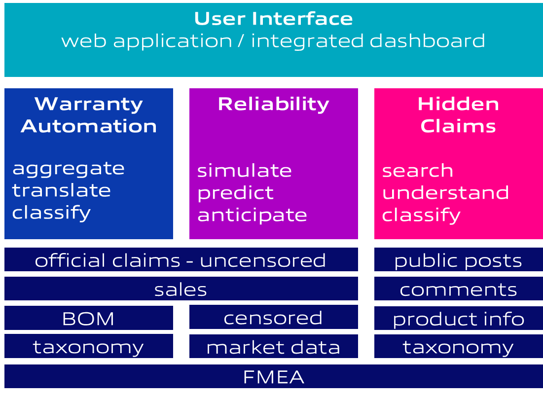 The three modules are independent and feed each other in a sequence: the starter Warranty Automation, the advanced Warranty, Reliability and finally Hidden Claims to add data from the web.
